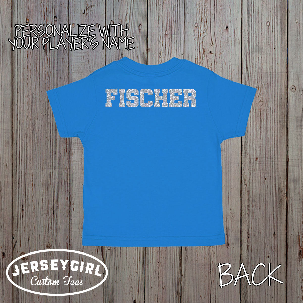 Enter 2 glitter design colors: 1 glitter color for "Daddy's" and "Fan" on the front; and 1 design color for "BIGGEST" and the tennis racket detail on the front, and your tennis player's name on the back.